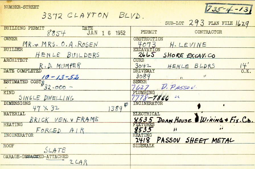 3372 Clayton Boulevard Shaker Heights, OH 44120 PARCEL ID: 735-04-013 Building Permit Date: 01-16-1952 Plan File Number: 1629 scanned, 6281 Microfilm Roll: Roll025, Roll#84 Neighborhood: Onaway Owner: Rosen, Mr. and Mrs. O. A. Builder: Henle Builders Architect: Mumper, R. D. Estimated Cost: 32000 Date Completed: 10-13-1952 Kind: Single, Single Residence or Dwelling Material: Brick Veneer and Frame Heating: Forced Air Roof: Slate Garage: attached 2 car |