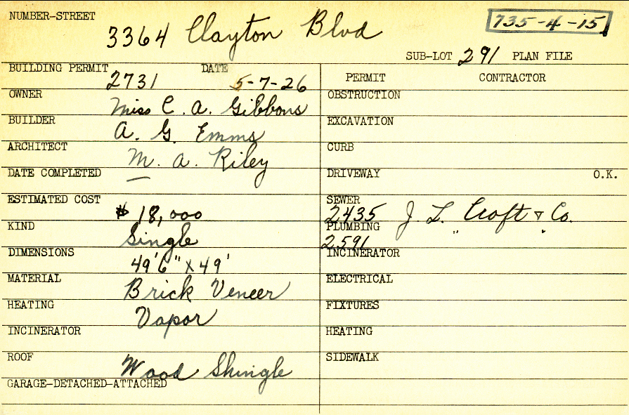 3364 Clayton Boulevard Shaker Heights, OH 44120 PARCEL ID: 735-04-015 Building Permit Date: 05-07-1926 Plan File Number: 0 Neighborhood: Onaway Owner: Gibbons, Miss C. A. Builder: Emms, A. G. Architect: Riley, M. A. Estimated Cost: 18000 Kind: Single, Single Residence or Dwelling Material: Brick Veneer Heating: Vapor Roof: Wood Shingle |