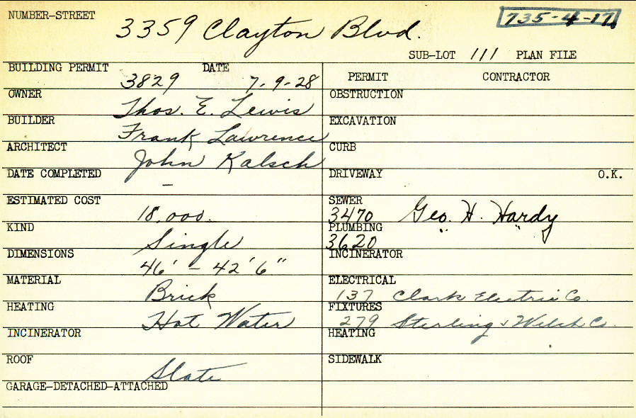 3359 Clayton Boulevard Shaker Heights, OH 44120 PARCEL ID: 735-04-017 Building Permit Date: 07-09-1928 Neighborhood: Onaway Owner: Lewis, Thomas E. Builder: Lawrence, Frank Architect: Kalsch, John Estimated Cost: 18000 Kind: Single, Single Residence or Dwelling Material: Brick Heating: Hot Water Roof: Slate Blueprints: no blueprints on microfilm |