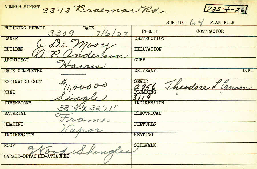 3343 Braemar Road Shaker Heights, OH 44120 PARCEL ID: 735-04-026 Building Permit Date: 07-06-1927 Plan File Number: 0 Neighborhood: Onaway Owner: DeMovy, J. Builder: Anderson, A. P. Architect: Harris Estimated Cost: 11,000 Kind: Single, Single Residence or Dwelling Material: Frame Heating: Vapor Roof: Wood Shingle Card Available: yes |