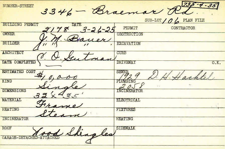 3346 Braemar Road Shaker Heights, OH 44120 PARCEL ID: 735-04-035 Building Permit Date: 03-26-1925 Plan File Number: 0 Neighborhood: Onaway Owner: Bauer, J. M. Builder: Bauer, J. M. Architect: Gutman, C. O. Estimated Cost: 10000 Kind: Single, Single Residence or Dwelling Material: Frame Heating: Steam Roof: Wood Shingle |
