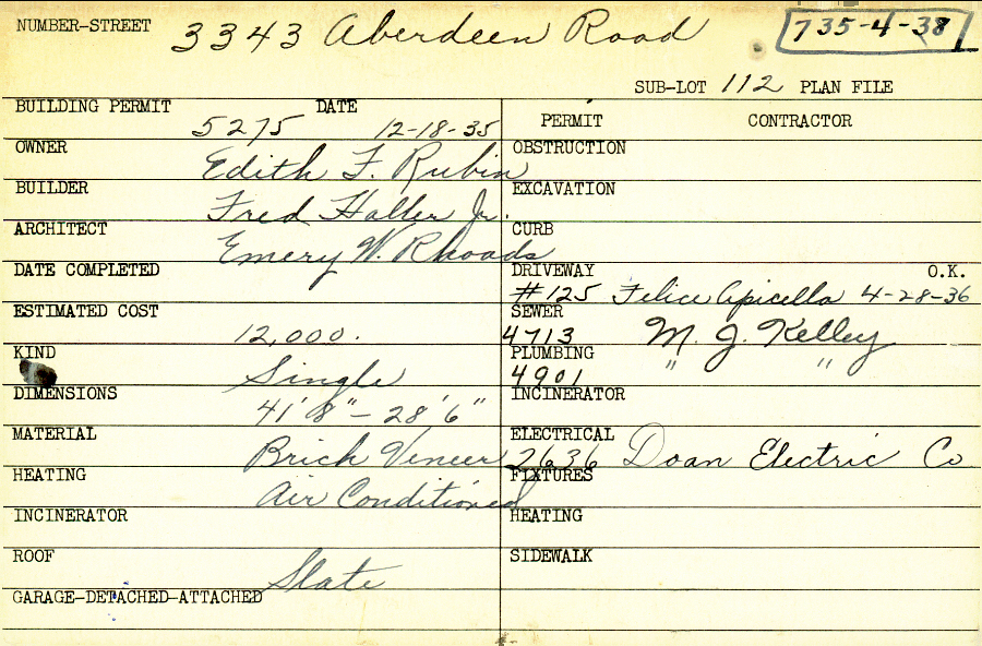 3343 Aberdeen Road Shaker Heights, OH 44120 PARCEL ID: 735-04-038 Building Permit Date: 12-18-1935 Neighborhood: Onaway Owner: Rubin, Edith F. Builder: Haller, Fred Jr. Architect: Rhoads, Emery W. Estimated Cost: 12000 Kind: Single, Single Residence or Dwelling Material: Brick Veneer Heating: Air Conditioned Roof: Slate Blueprints: no blueprints on microfilm |  |