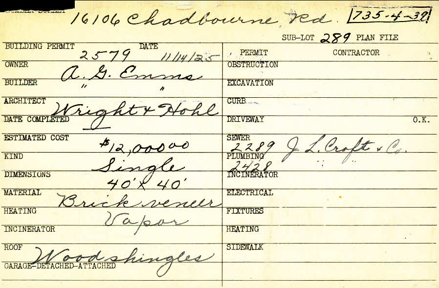16106 Chadbourne Road Shaker Heights, OH 44120 PARCEL ID: 735-04-039 Building Permit Date: 11-14-1925 Plan File Number: 0 Owner: Emms, A. G. Builder: Emms, A. G. Architect: Robert M. Wright and Russell L. Hohl Estimated Cost: 12000 Kind: Single, Single Residence or Dwelling Material: Brick Veneer Heating: Vapor Roof: Wood Shingle |