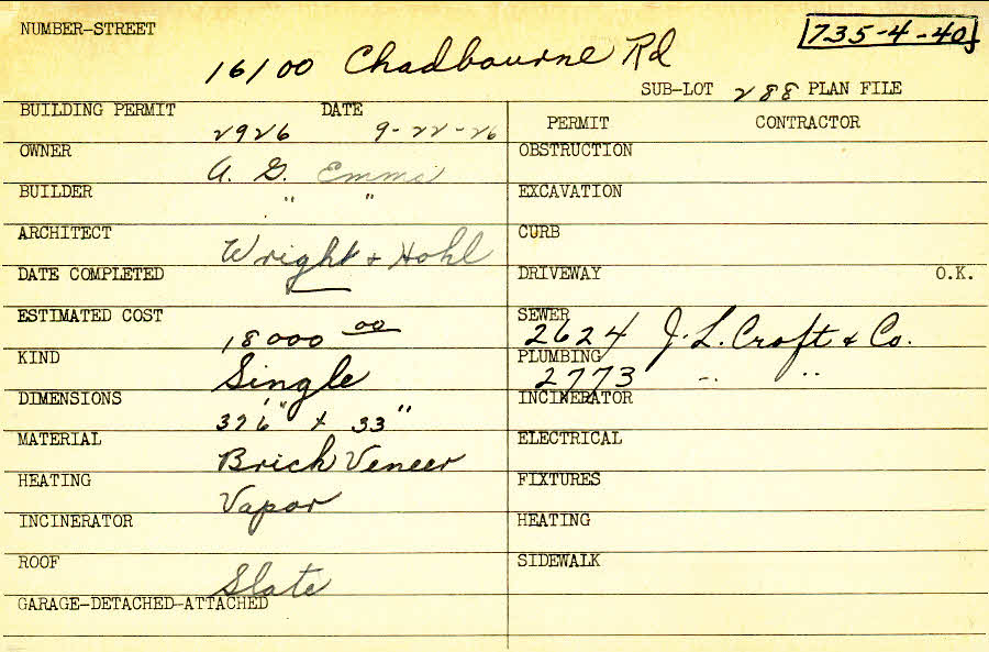 16100 Chadbourne Road Shaker Heights, OH 44120 PARCEL ID: 735-04-040 Building Permit Date: 09-22-1926 Plan File Number: 828 all scanned Microfilm Roll: Roll011 Owner: Emms, A. G. Builder: Emms, A. G. Architect: Robert M. Wright and Russell L. Hohl Estimated Cost: 18000 Kind: Single, Single Residence or Dwelling Material: Brick Veneer Heating: Vapor Roof: Slate |