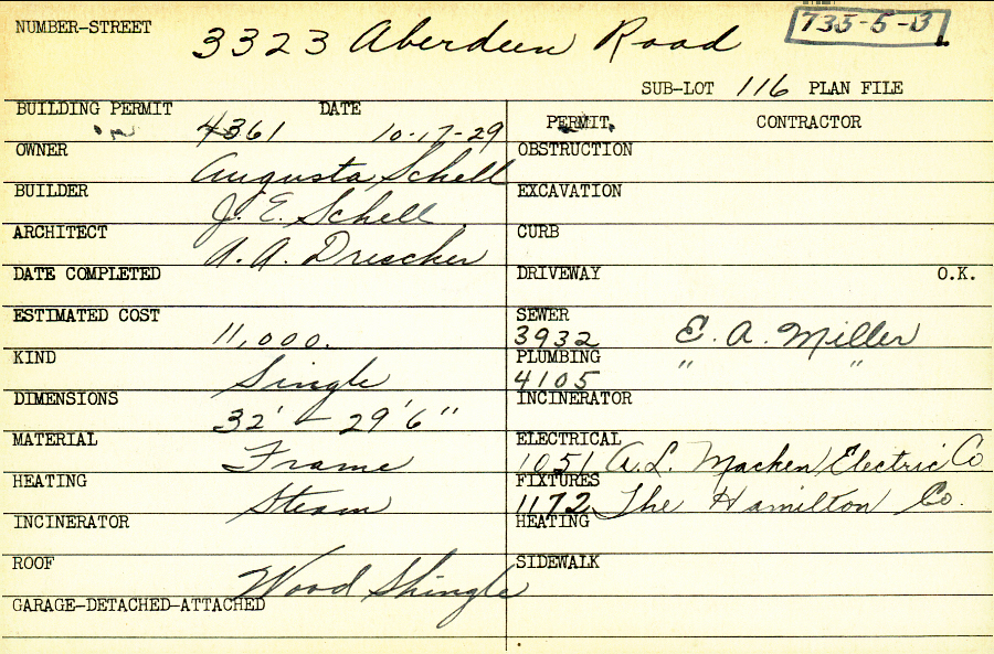 3323 Aberdeen Road Shaker Heights, OH 44120 PARCEL ID: 735-05-003 Building Permit Date: 10-17-1929 Plan File Number: 7026 Microfilm Roll: Roll#90 Neighborhood: Onaway Owner: Schell, Augusta Builder: Schell, J. E. Architect: Drescher, A. A. Estimated Cost: 11000 Kind: Single, Single Residence or Dwelling Material: Frame Heating: Steam Roof: Wood Shingle |  |