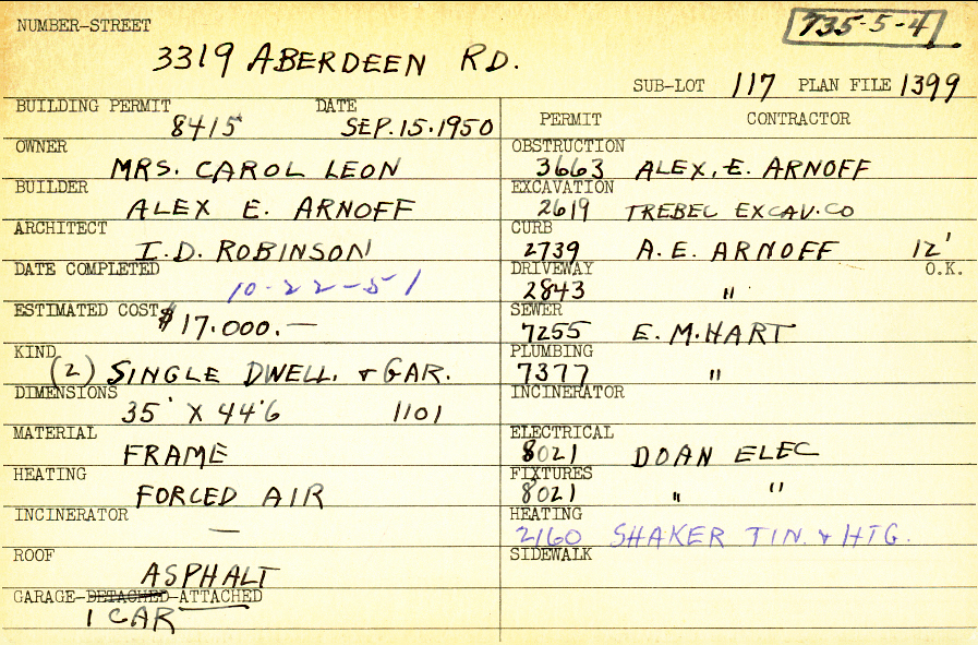 3319 Aberdeen Road Shaker Heights, OH 44120 PARCEL ID: 735-05-004 Building Permit Date: 09-15-1950 Plan File Number: 1399, 3718, 5832, 10738 Microfilm Roll: Roll016, Roll#51, Roll#79, NewRoll#5 Neighborhood: Onaway Owner: Leon, Mrs. Carol Builder: Arnoff, Alex E. Architect: Robinson, Irving D. Estimated Cost: 17000 Date Completed: 10-22-1951 Kind: Single Dwelling and Garage (2) Material: Frame Heating: Forced Air Roof: Asphalt Garage: attached |  |