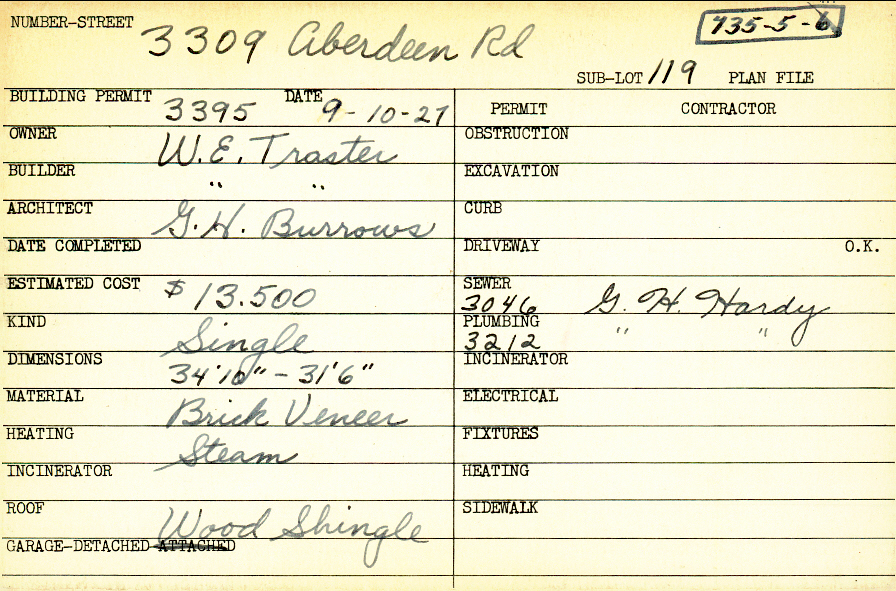 3309 Aberdeen Road Shaker Heights, OH 44120 PARCEL ID: 735-05-006 Building Permit Date: 09-10-1927 Plan File Number: 6368, 9997 Microfilm Roll: Roll#85, Roll#105 Neighborhood: Onaway Owner: Traster, W. E. Builder: Traster, W. E. Architect: Burrows, George H. Estimated Cost: 13500 Kind: Single, Single Residence or Dwelling Material: Brick Veneer Heating: Steam Roof: Wood Shingle Garage: detached |  |