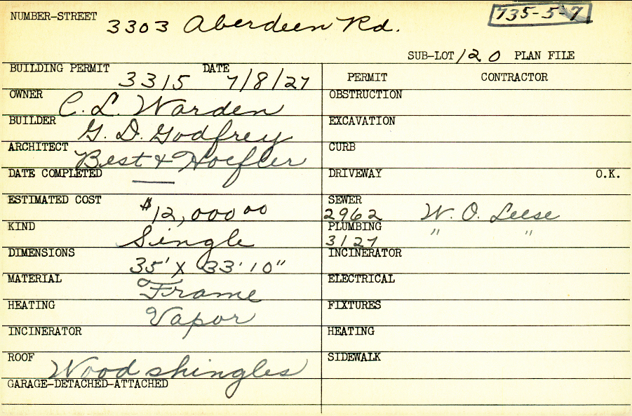 3303 Aberdeen Road Shaker Heights, OH 44120 PARCEL ID: 735-05-007 Building Permit Date: 07-08-1927 Plan File Number: 11294 all scanned Microfilm Roll: NewRoll07 Neighborhood: Onaway Owner: Warden, C. L. Builder: Godfrey, G. D. Architect: Best and Hoefler Estimated Cost: 12000 Kind: Single, Single Residence or Dwelling Material: Frame Heating: Vapor Roof: Wood Shingle Blueprints: online, see link above |  |