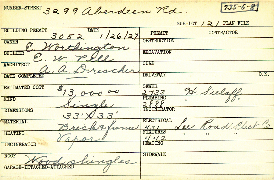 3299 Aberdeen Road Shaker Heights, OH 44120 PARCEL ID: 735-05-008 Building Permit Date: 01-26-1927 Plan File Number: 11681 Microfilm Roll: NewRoll#8 Neighborhood: Onaway Owner: Worthington, E. Builder: Pell, E. W. Architect: Drescher, A. A. Estimated Cost: 13000 Kind: Single, Single Residence or Dwelling Material: Brick and Frame Heating: Vapor Roof: Wood Shingle |  |