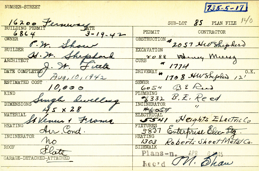 16200 Fernway Road Shaker Heights, OH 44120 PARCEL ID: 735-05-017 Building Permit Date: 03-19-1942 Plan File Number: 140 Neighborhood: Onaway Owner: Shaw, P. W. Builder: Shepherd, H. W. Architect: Little, John W. Estimated Cost: 10000 Date Completed: 08-10-1942 Kind: Single, Single Residence or Dwelling Material: Stone Veneer and Frame Heating: Air Conditioned Roof: Slate Garage: attached |