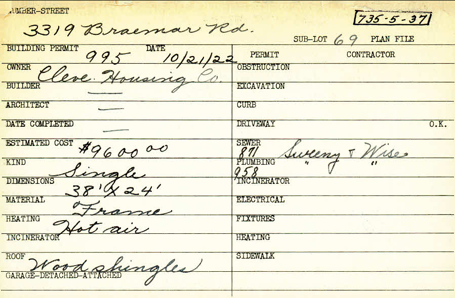 3319 Braemar Road Shaker Heights, OH 44120 PARCEL ID: 735-05-037 Building Permit Date: 10-21-1922 Plan File Number: 2746 Microfilm Roll: Roll #38 Neighborhood: Onaway Owner: Cleveland Housing Company Estimated Cost: 9600 Kind: Single, Single Residence or Dwelling Material: Frame Heating: Hot Air Roof: Wood Shingle |