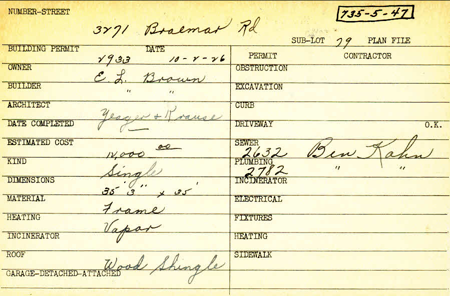 3271 Braemar Road Shaker Heights, OH 44120 PARCEL ID: 735-05-047 Building Permit Date: 10-02-1926 Plan File Number: 93-25* Microfilm Roll: NewRoll#16 Neighborhood: Onaway Owner: Brown, E. L. Builder: Brown, E. L. Architect: Yeager and Krause Estimated Cost: 12000 Kind: Single, Single Residence or Dwelling Material: Frame Heating: Vapor Roof: Wood Shingle |