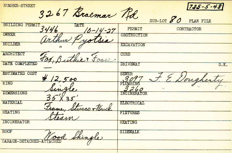 3267 Braemar Road Shaker Heights, OH 44120 PARCEL ID: 735-05-048 Building Permit Date: 10-14-1927 Plan File Number: 10691 Microfilm Roll: NewRoll#5 Neighborhood: Onaway Owner: Pyotsia, Arthur Builder: Pyotsia, Arthur Architect: Fox, Duthie and Foose Estimated Cost: 12500 Kind: Single, Single Residence or Dwelling Material: Frame, Stucco and Brick Heating: Steam Roof: Wood Shingle |