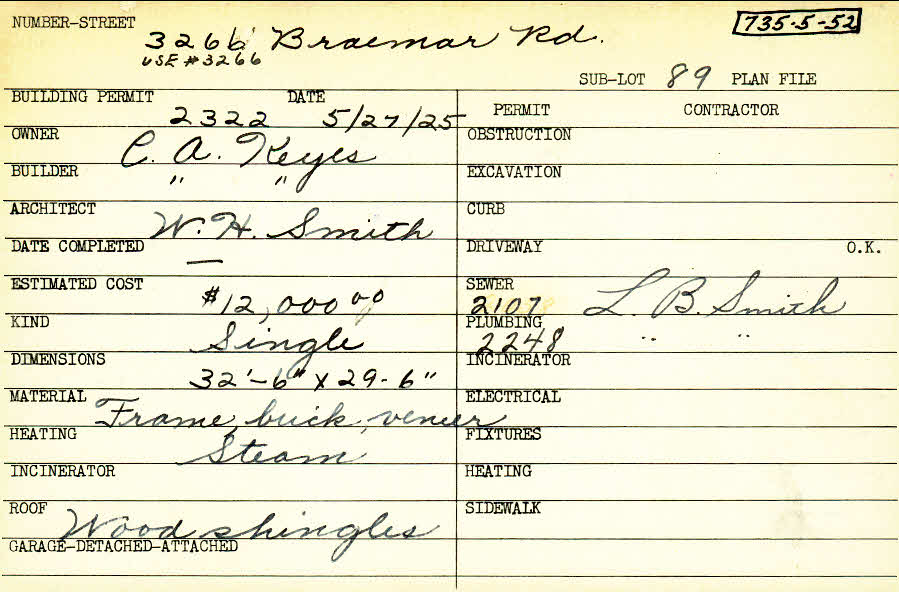 3266 Braemar Road Shaker Heights, OH 44120 PARCEL ID: 735-05-052 Building Permit Date: 05-27-1925 Plan File Number: 0 Neighborhood: Onaway Owner: Keyes, C. A. Builder: Keyes, C. A. Architect: Smith, W. H. Estimated Cost: 12000 Kind: Single, Single Residence or Dwelling Material: Frame, Brick, Veneer Heating: Steam Roof: Wood Shingle |