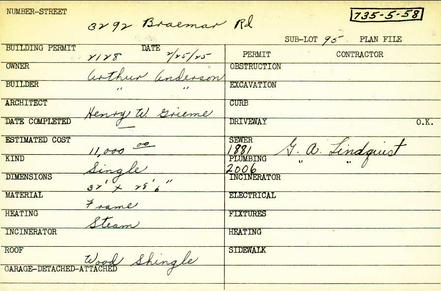3292 Braemar Road Shaker Heights, OH 44120 PARCEL ID: 735-05-058 Building Permit Date: 02-25-1925 Plan File Number: 0 Neighborhood: Onaway Owner: Anderson, Arthur Builder: Anderson, Arthur Architect: Grieme, Henry W. Estimated Cost: 11000 Kind: Single, Single Residence or Dwelling Material: Frame Heating: Steam Roof: Wood Shingle |