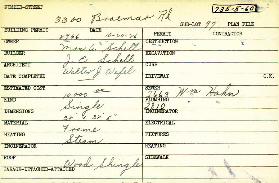 3300 Braemar Road Shaker Heights, OH 44120 PARCEL ID: 735-05-060 Building Permit Date: 10-20-1926 Plan File Number: 0 Neighborhood: Onaway Owner: Schell, Mrs. A. Builder: Schell J. E. Architect: Wefel, Walter J. Estimated Cost: 10000 Kind: Single, Single Residence or Dwelling Material: Frame Heating: Steam Roof: Wood Shingle |