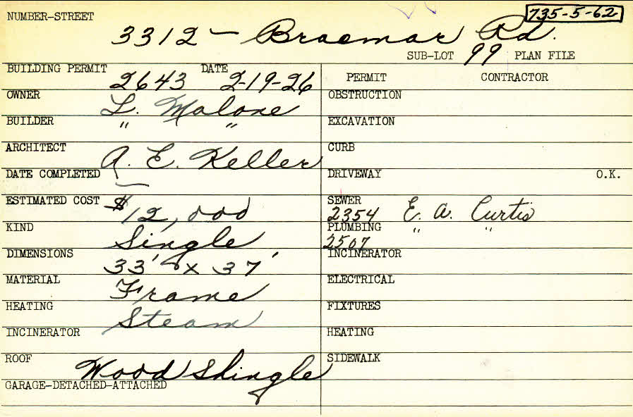 3312 Braemar Road Shaker Heights, OH 44120 PARCEL ID: 735-05-062 Building Permit Date: 02-19-1926 Plan File Number: 6885 Microfilm Roll: Roll#89 Neighborhood: Onaway Owner: Malone, L, Builder: Malone, L. Architect: Keller, Arthur Emil Estimated Cost: 12000 Kind: Single, Single Residence or Dwelling Material: Frame Heating: Steam Roof: Wood Shingle |