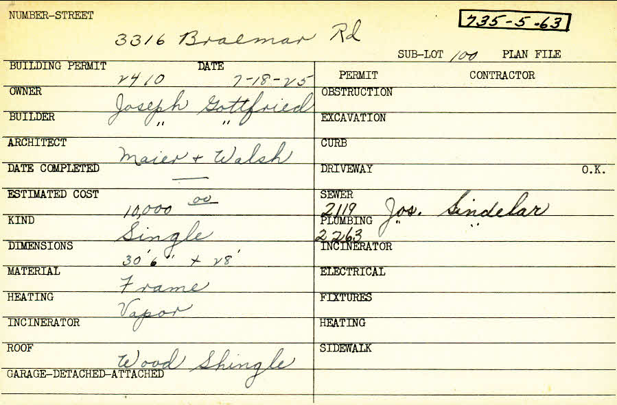 3316 Braemar Road Shaker Heights, OH 44120 PARCEL ID: 735-05-063 Building Permit Date: 07-18-1925 Plan File Number: 0 Neighborhood: Onaway Owner: Gottfried, Joseph Builder: Gottfried, Joseph Architect: Maier and Walsh Estimated Cost: 10000 Kind: Single, Single Residence or Dwelling Material: Frame Heating: Vapor Roof: Wood Shingle |
