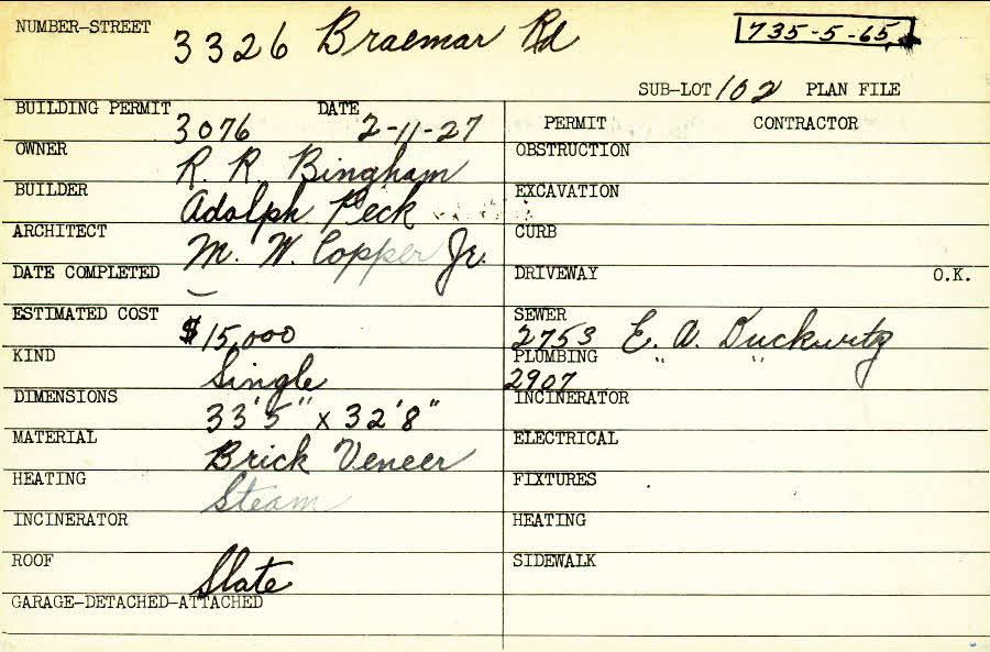 3326 Braemar Road Shaker Heights, OH 44120 PARCEL ID: 735-05-065 Building Permit Date: 02-11-1927 Plan File Number: 0 Neighborhood: Onaway Owner: Bingham, R. R. Builder: Peck, Adolph Architect: Copper, Munroe Walker Jr. Estimated Cost: 15000 Kind: Single, Single Residence or Dwelling Material: Brick Veneer Heating: Steam Roof: Slate |