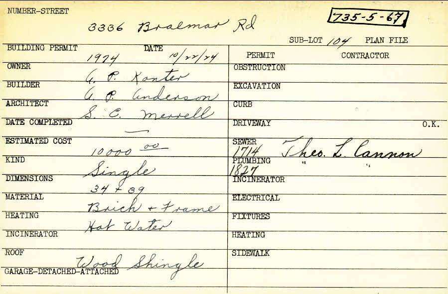 3336 Braemar Road Shaker Heights, OH 44120 PARCEL ID: 735-05-067 Building Permit Date: 10-22-1924 Plan File Number: 0 Neighborhood: Onaway Owner: Kanter, A. P. Builder: Anderson, A. P. Architect: Merrell, S. C. Estimated Cost: 10000 Kind: Single, Single Residence or Dwelling Material: Brick and Frame Heating: Hot Water Roof: Wood Shingle |