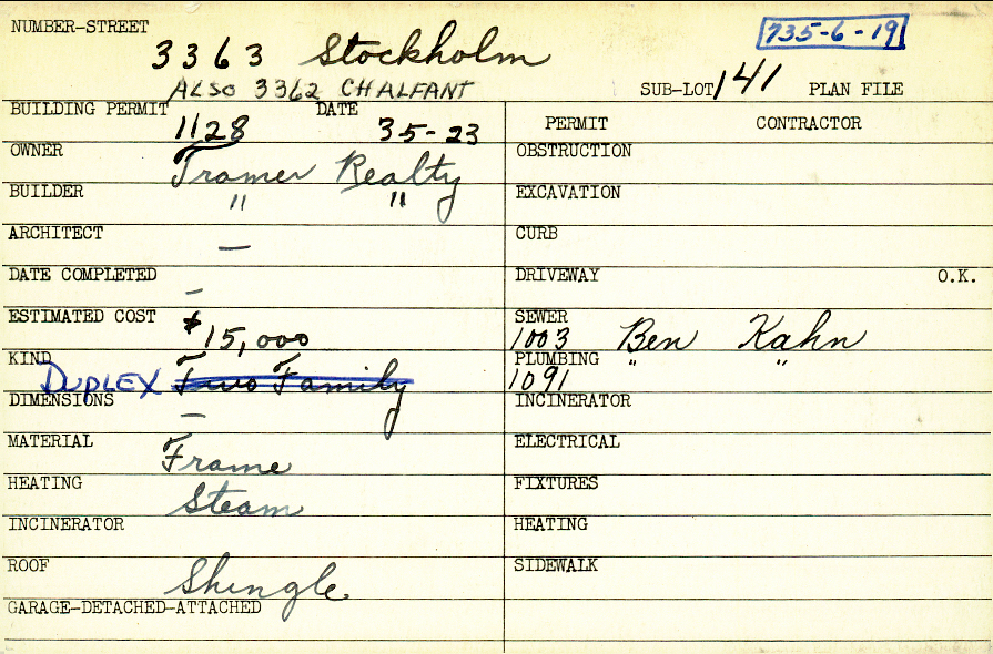 3363 Stockholm Road Shaker Heights, OH 44120 PARCEL ID: 735-06-019 Building Permit Date: 03-05-1923 Plan File Number: 0 Neighborhood: Fernway Owner: Tramer Realty Builder: Tramer Realty Estimated Cost: 15000 Kind: Duplex or Two-Family Material: Frame Heating: Steam Roof: Shingles |
