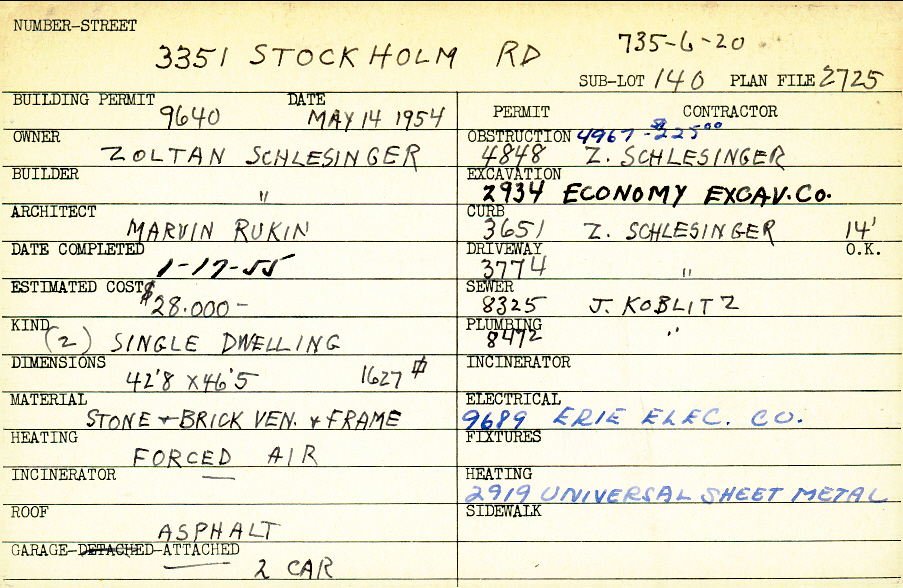3351 Stockholm Road Shaker Heights, OH 44120 PARCEL ID: 735-06-020 Building Permit Date: 05-14-1954 Plan File Number: 2725 Microfilm Roll: Roll #37 Neighborhood: Fernway Owner: Schlesinger, Zoltan Builder: Schlesinger, Zoltan Architect: Rukin, Marvin Estimated Cost: 28000 Date Completed: 01-17-1955 Kind: Single, Single Residence or Dwelling (2) Material: Stone and Brick Veneer and Frame Heating: Forced Air Roof: Asphalt Garage: attached 2 car |