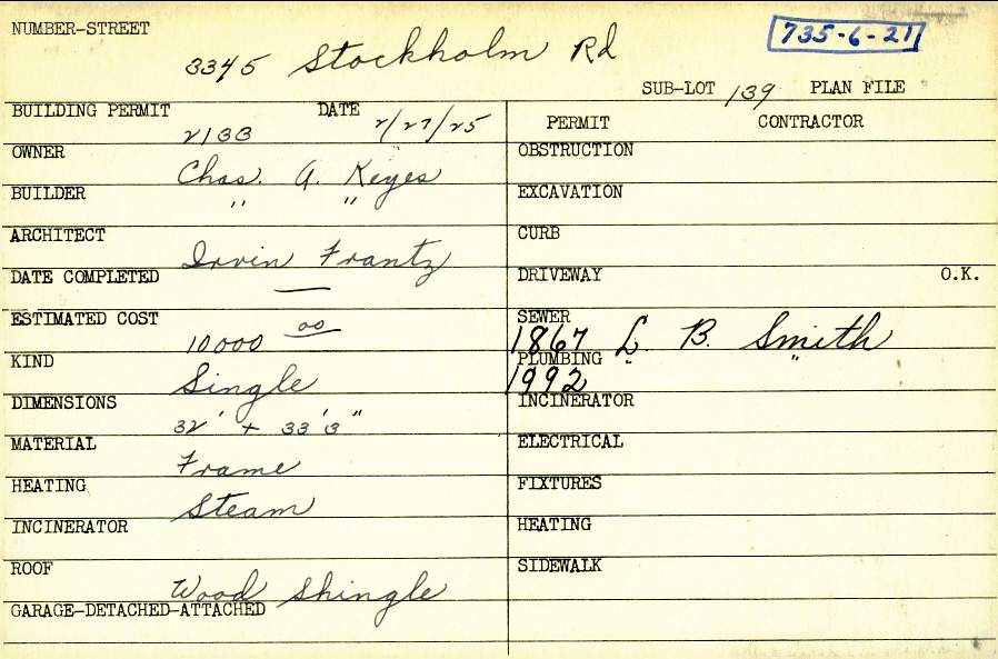 3345 Stockholm Road Shaker Heights, OH 44120 PARCEL ID: 735-06-021 Building Permit Date: 02-27-1925 Plan File Number: 0 Neighborhood: Fernway Owner: Keyes, Charles A. Builder: Keyes, Charles A. Architect: Frantz, Irvin J. Estimated Cost: 10000 Kind: Single, Single Residence or Dwelling Material: Frame Heating: Steam Roof: Wood Shingle |