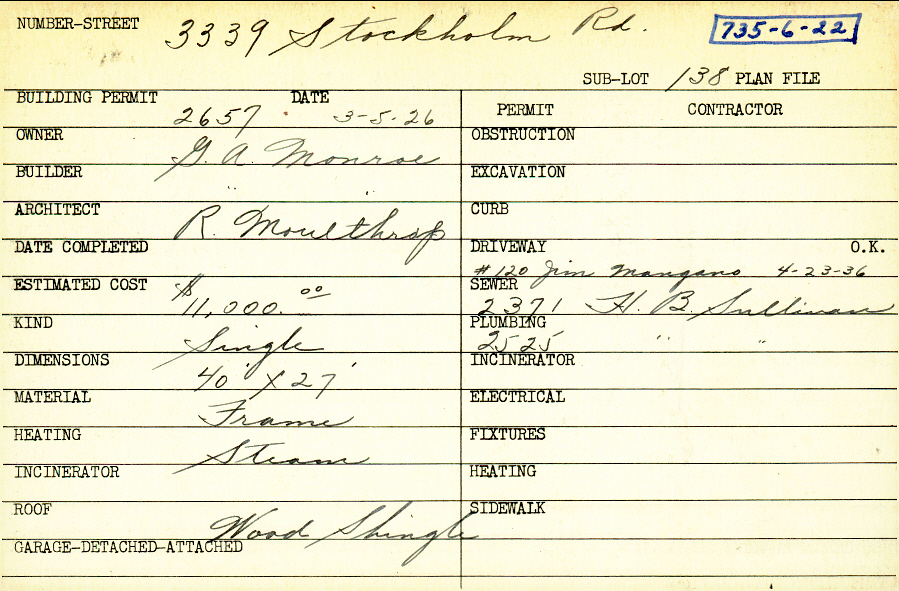 3339 Stockholm Road Shaker Heights, OH 44120 PARCEL ID: 735-06-022 Building Permit Date: 03-05-1926 Plan File Number: 0 Neighborhood: Fernway Owner: Monroe, G. A. Builder: Monroe, G. A. Architect: Moulthrop, R. Estimated Cost: 11000 Kind: Single, Single Residence or Dwelling Material: Frame Heating: Steam Roof: Wood Shingle |