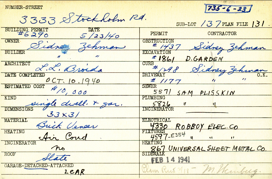 3333 Stockholm Road Shaker Heights, OH 44120 PARCEL ID: 735-06-023 Building Permit Date: 05-23-1940 Plan File Number: 131 Neighborhood: Fernway Owner: Zehman, Sidney Builder: Zehman, Sidney Architect: Broida, L. L. Estimated Cost: 10000 Date Completed: 10-10-1940 Kind: Single Dwelling and Garage Material: Brick Veneer Heating: Air Conditioned Roof: Slate Garage: detached 2 car |