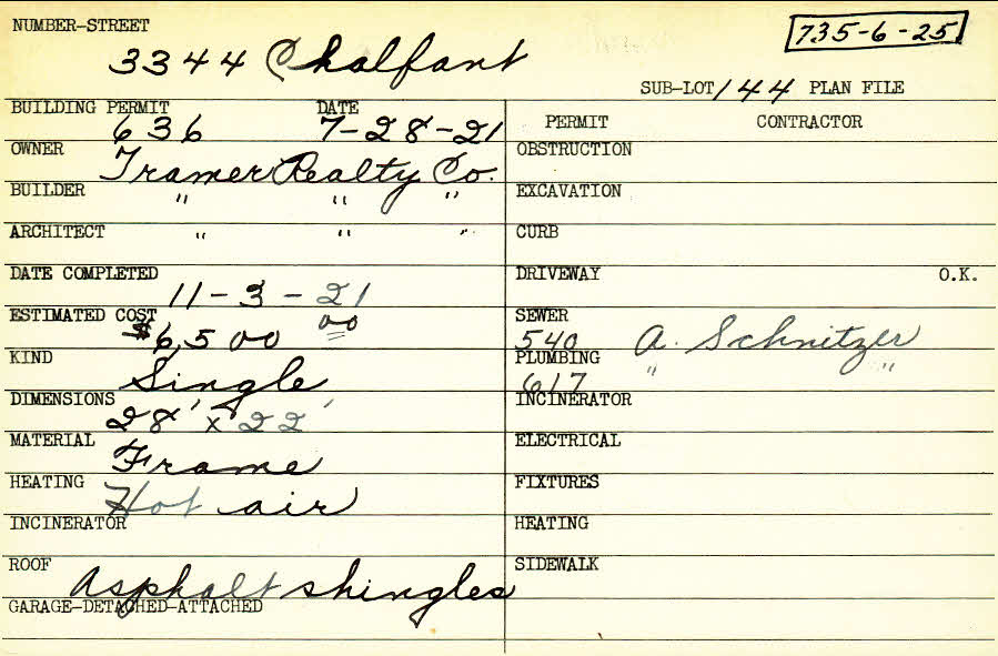 3344 Chalfant Road Shaker Heights, OH 44120 PARCEL ID: 735-06-025 Building Permit Date: 07-28-1921 Plan File Number: 3696, 10294, 10489 Microfilm Roll: Roll#55, NewRoll#3, NewRoll#4 Neighborhood: Fernway Owner: Tramer Realty Company Builder: Tramer Realty Company Architect: Tramer Realty Company Estimated Cost: 6500 Date Completed: 11-03-1921 Kind: Single, Single Residence or Dwelling Material: Frame Heating: Hot Air Roof: Asphalt Shingles |