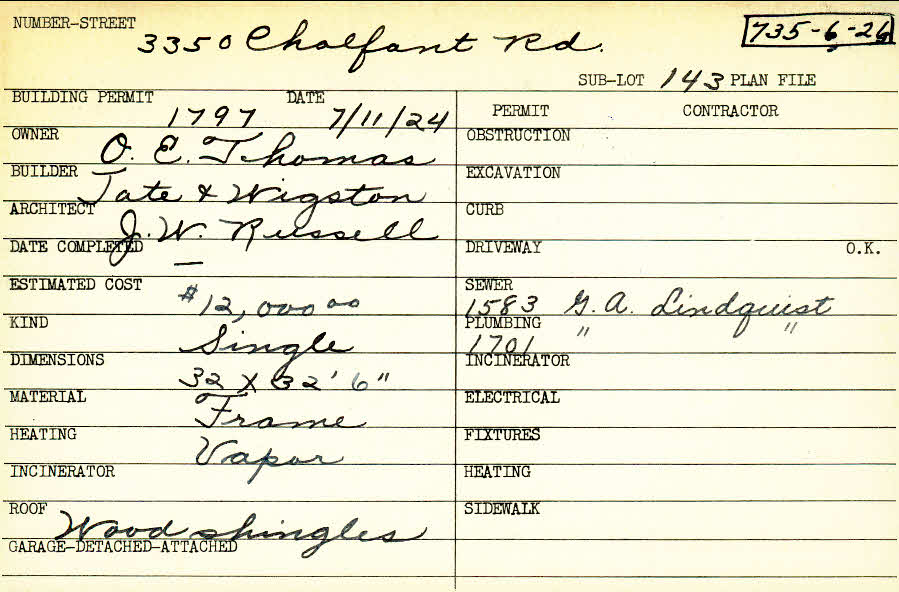 3350 Chalfant Road Shaker Heights, OH 44120 PARCEL ID: 735-06-026 Building Permit Date: 07-11-1924 Plan File Number: 0 Neighborhood: Fernway Owner: Thomas, O. E. Builder: Tate and Wigston Architect: Russell, J. W. Estimated Cost: 12000 Kind: Single, Single Residence or Dwelling Material: Frame Heating: Vapor Roof: Wood Shingle Card Available: yes |