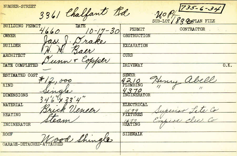 3361 Chalfant Road Shaker Heights, OH 44120 PARCEL ID: 735-06-034 Building Permit Date: 10-17-1930 Plan File Number: 4087 Microfilm Roll: Roll#59 Neighborhood: Fernway Owner: Drake, James J. Builder: Baer, H. H. Architect: Dunn and Copper Estimated Cost: 12000 Kind: Single, Single Residence or Dwelling Material: Brick Veneer Heating: Steam Roof: Wood Shingle |