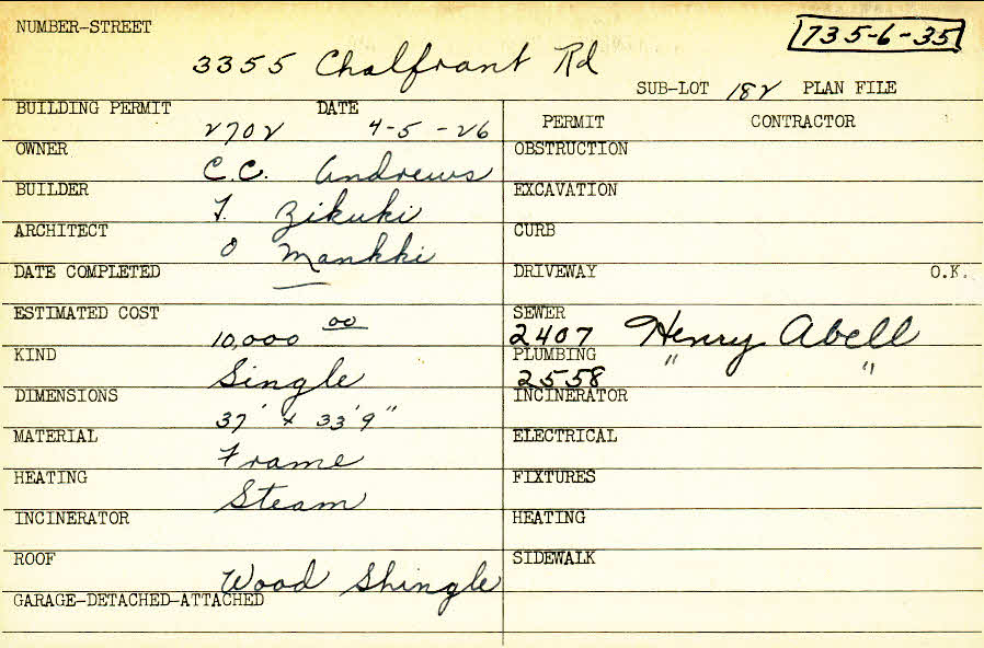 3355 Chalfant Road Shaker Heights, OH 44120 PARCEL ID: 735-06-035 Building Permit Date: 04-05-1926 Plan File Number: 4856 Microfilm Roll: Roll#66 Neighborhood: Fernway Owner: Andrews, C. C Builder: Zikuki, T. Architect: Mankki, O. Estimated Cost: 10000 Kind: Single, Single Residence or Dwelling Material: Frame Heating: Steam Roof: Wood Shingle |