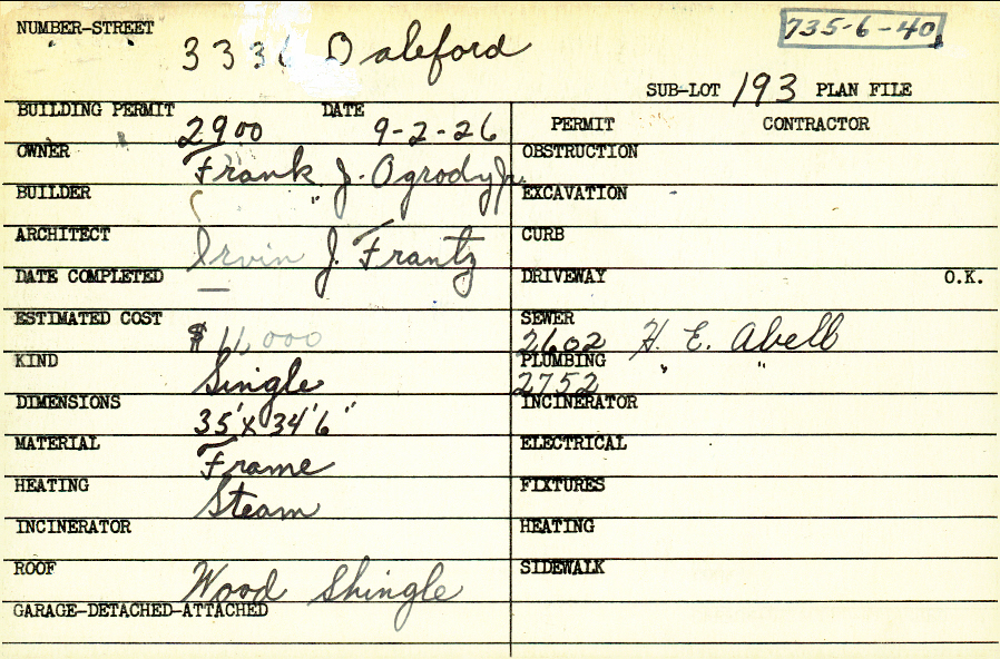 3336 Daleford Road Shaker Heights, OH 44120 PARCEL ID: 735-06-040 Building Permit Date: 09-02-1926 Plan File Number: 11628 Microfilm Roll: NewRoll#8 Neighborhood: Fernway Owner: Ogrody, Frank J. Jr. Builder: Ogrody, Frank J. Jr. Architect: Frantz, Irvin J. Estimated Cost: 11000 Kind: Single, Single Residence or Dwelling Material: Frame Heating: Steam Roof: Wood Shingle |