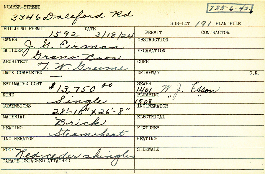3346 Daleford Road Shaker Heights, OH 44120 PARCEL ID: 735-06-042 Building Permit Date: 03-18-1924 Plan File Number: 859 all scanned Microfilm Roll: Roll011 Neighborhood: Fernway Owner: Eirman, J. G. Builder: Grano Brothers Architect: Greime, T. W. Estimated Cost: 13750 Kind: Single, Single Residence or Dwelling Material: Brick Heating: Steam Roof: Shingles |