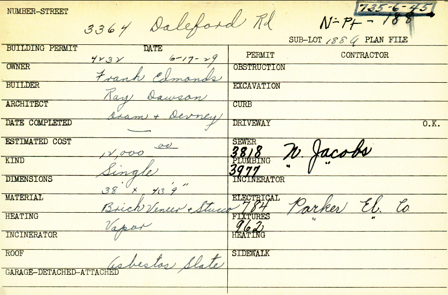 3364 Daleford Road Shaker Heights, OH 44120 PARCEL ID: 735-06-045 Building Permit Date: 06-17-1929 Plan File Number: 0 Neighborhood: Fernway Owner: Edmonds, Frank Builder: Dawson, Ray Architect: Oram and Devney Estimated Cost: 12000 Kind: Single, Single Residence or Dwelling Material: Brick Veneer and Stucco Heating: Vapor Roof: Slate |