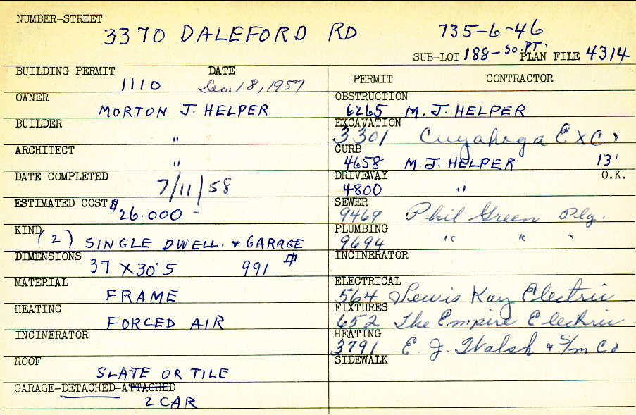 3370 Daleford Road Shaker Heights, OH 44120 PARCEL ID: 735-06-046 Building Permit Date: 12-18-1957 Plan File Number: 4314 all scanned Microfilm Roll: Roll062 Neighborhood: Fernway Owner: Helper, Morton J. Builder: Helper, Morton J. Architect: Helper, Morton J. Estimated Cost: 26000 Date Completed: 07-11-1958 Kind: Single Dwelling and Garage (2) Material: Frame Heating: Forced Air Garage: detached 2 car |