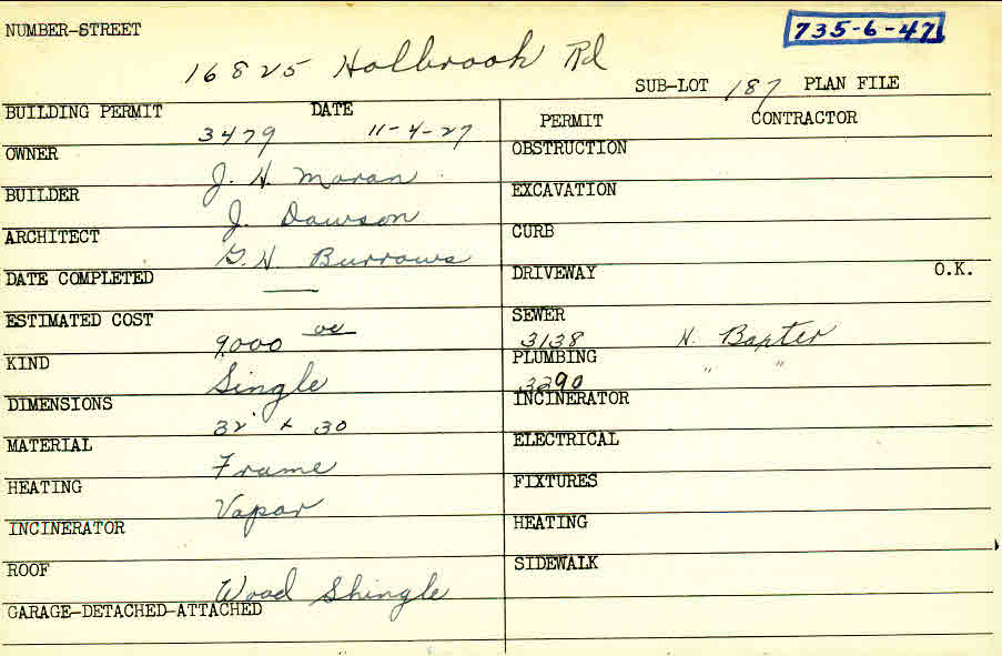 16825 Holbrook Road Shaker Heights, OH 44120 PARCEL ID: 735-06-047 Building Permit Date: 11-04-1927 Plan File Number: 4785, 5774 Microfilm Roll: Roll#66, Roll#78 Neighborhood: Fernway Owner: Moran, J. H. Builder: Dawson, J. Architect: Burrows, G. H. Estimated Cost: 9000 Kind: Single, Single Residence or Dwelling Material: Frame Heating: Vapor Roof: Wood Shingle |