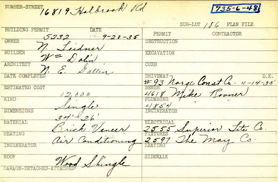16819 Holbrook Road Shaker Heights, OH 44120 PARCEL ID: 735-06-048 Building Permit Date: 09-28-1935 Plan File Number: 0 Neighborhood: Fernway Owner: Leidner, N. Builder: Dolin, William Architect: Gallin, N. E. Estimated Cost: 12000 Kind: Single, Single Residence or Dwelling Material: Brick Veneer Heating: Air Conditioned Roof: Wood Shingle Card Available: yes |