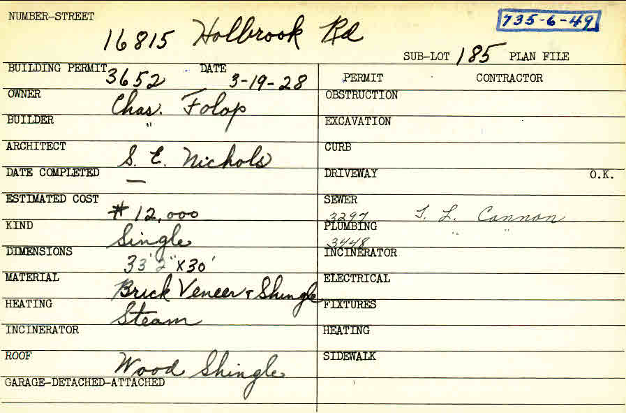 16815 Holbrook Road Shaker Heights, OH 44120 PARCEL ID: 735-06-049 Building Permit Date: 03-19-1928 Plan File Number: 0 Neighborhood: Fernway Owner: Folop, Charles Builder: Folop, Charles Architect: Nichols, S. E. Estimated Cost: 12000 Kind: Single, Single Residence or Dwelling Material: Brick Veneer and Shingle Heating: Steam Roof: Wood Shingle Card Available: yes |