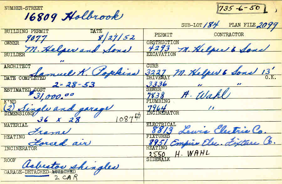 16809 Holbrook Road Shaker Heights, OH 44120 PARCEL ID: 735-06-050 Building Permit Date: 08-27-1952 Plan File Number: 2099, 9529 Microfilm Roll: Roll#32, Roll#103 Neighborhood: Fernway Owner: M. Helper and Sons Builder: M. Helper and Sons Architect: Popkins, Samuel K. Estimated Cost: 31000 Date Completed: 02-28-1953 Kind: Single Dwelling and Garage (2) Material: Frame Heating: Forced Air Roof: Asbestos Shingles Garage: detached 2 car |