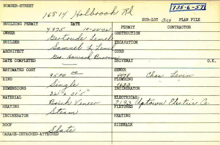 16814 Holbrook Road Shaker Heights, OH 44120 PARCEL ID: 735-06-057 Building Permit Date: 10-22-1932 Plan File Number: 4268 scanned, 7523 (7535) Microfilm Roll: Roll062, Roll#93 Neighborhood: Fernway Owner: Lemel, Gertrude Builder: Lemel, Samuel L. Architect: Burrows, George Howard Estimated Cost: 9500 Kind: Single, Single Residence or Dwelling Material: Brick Veneer Heating: Steam Roof: Slate |