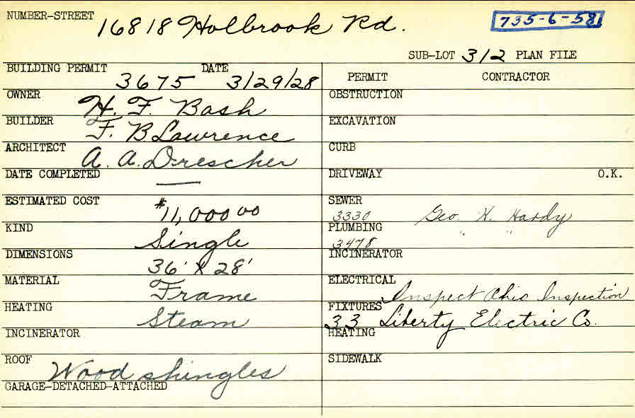 16818 Holbrook Road Shaker Heights, OH 44120 PARCEL ID: 735-06-058 Building Permit Date: 03-29-1928 Plan File Number: 10245 Microfilm Roll: NewRoll#3 Neighborhood: Fernway Owner: Bash, H. F. Builder: Lawrence, F. B. Architect: Drescher, A. A. Estimated Cost: 11000 Kind: Single, Single Residence or Dwelling Material: Frame Heating: Steam Roof: Wood Shingle |