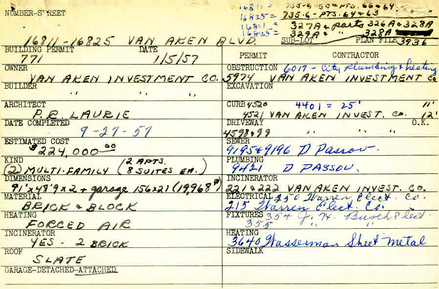 16811 Van Aken Boulevard Shaker Heights, OH 44120 PARCEL ID: 735-06-063 Building Permit Date: 01-05-1957 Plan File Number: 2227, 3936 Microfilm Roll: Roll#33, Roll#58 Neighborhood: Moreland Owner: Van Aken Investment Company Builder: Van Aken Investment Company Architect: Laurie, P. R. Estimated Cost: 224000 Date Completed: 09-27-1957 Kind: Apartment or Multi-family (3+) Material: Brick and Block Heating: Forced Air Roof: Slate Garage: attached |