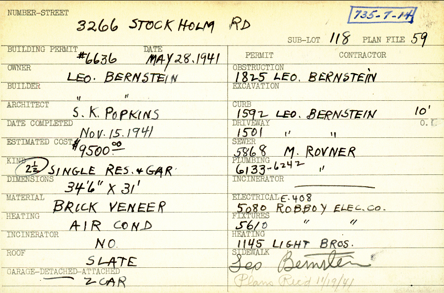 3266 Stockholm Road Shaker Heights, OH 44120 PARCEL ID: 735-07-014 Building Permit Date: 05-28-1941 Plan File Number: 59 Neighborhood: Fernway Owner: Bernstein, Leo Builder: Bernstein, Leo Architect: Popkins, S. K. Estimated Cost: 9500 Date Completed: 11-15-1941 Kind: Single 2-1/2 Material: Brick Veneer Heating: Air Conditioned Roof: Slate Garage: detached 2 car |