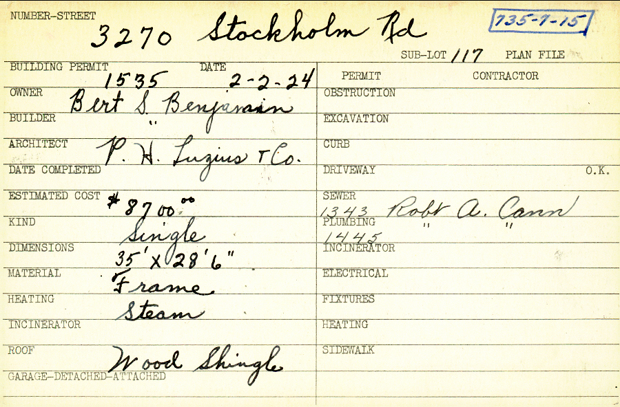 3270 Stockholm Road Shaker Heights, OH 44120 PARCEL ID: 735-07-015 Building Permit Date: 02-02-1924 Plan File Number: 2447 all scanned Microfilm Roll: Roll035 Neighborhood: Fernway Owner: Benjamin, Bert S. Builder: Benjamin, Bert S. Architect: P. H. Luzius and Company Estimated Cost: 8700 Kind: Single, Single Residence or Dwelling Material: Frame Heating: Steam Roof: Wood Shingle |
