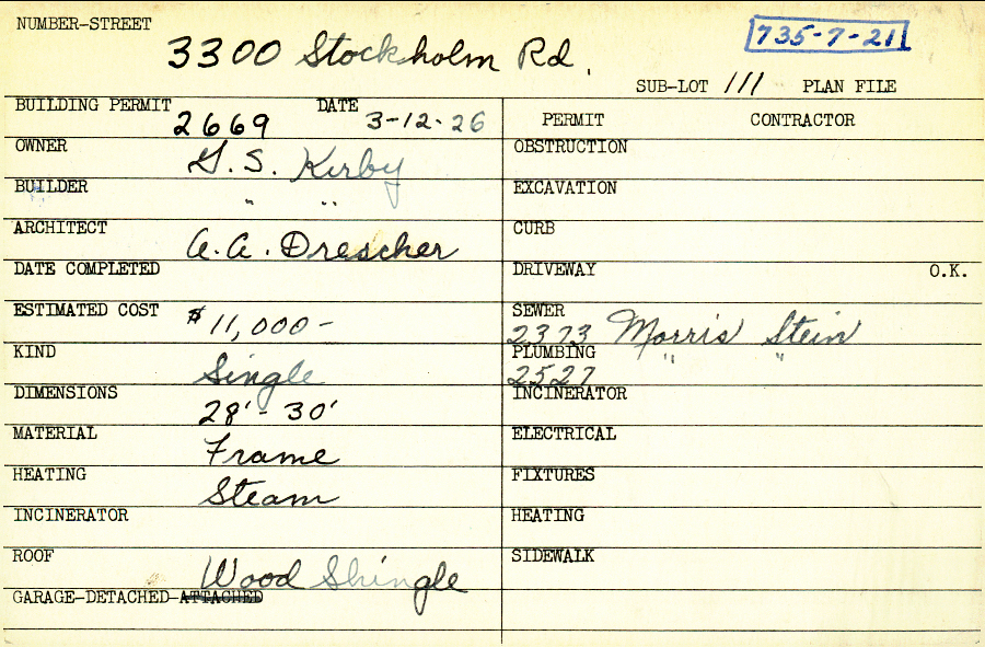 3300 Stockholm Road Shaker Heights, OH 44120 PARCEL ID: 735-07-021 Building Permit Date: 03-12-1926 Plan File Number: 0 Neighborhood: Fernway Owner: Kirby, G. S. Builder: Kirby, G. S. Architect: Drescher, A. A. Estimated Cost: 11000 Kind: Single, Single Residence or Dwelling Material: Frame Heating: Steam Roof: Wood Shingle Garage: detached Card Available: yes |