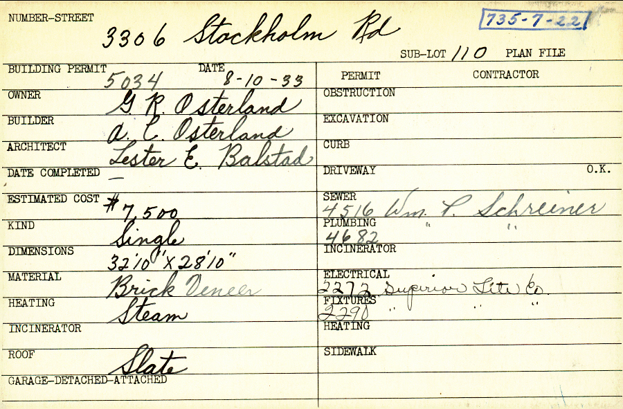 3306 Stockholm Road Shaker Heights, OH 44120 PARCEL ID: 735-07-022 Building Permit Date: 08-10-1933 Plan File Number: 0 Neighborhood: Fernway Owner: Osterland, G. R. Builder: Osterland, A. C. Architect: Balstad, Lester E. Estimated Cost: 7500 Kind: Single, Single Residence or Dwelling Material: Brick Veneer Heating: Steam Roof: Slate Card Available: yes |