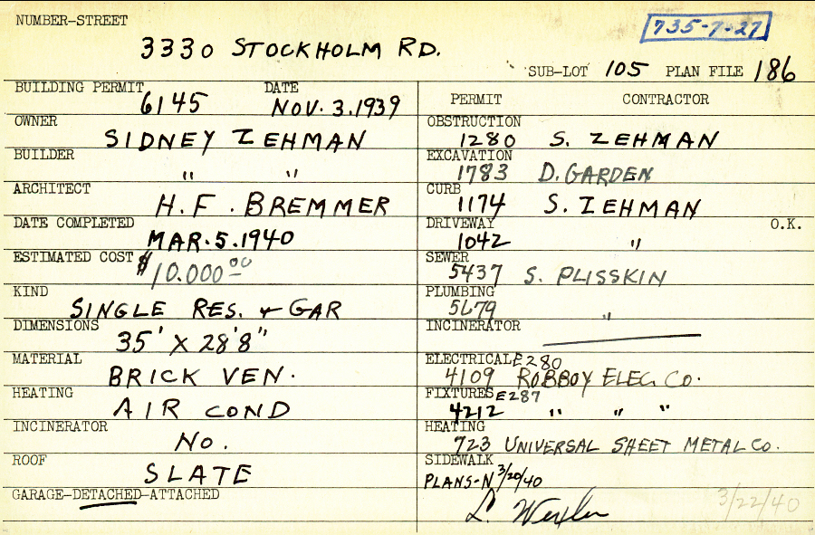 3330 Stockholm Road Shaker Heights, OH 44120 PARCEL ID: 735-07-027 Building Permit Date: 11-03-1939 Plan File Number: 186 Neighborhood: Fernway Owner: Zehman, Sidney Builder: Zehman, Sidney Architect: Bremmer, Harry F. Estimated Cost: 10000 Date Completed: 03-05-1940 Kind: Single Dwelling and Garage Material: Brick Veneer Heating: Air Conditioned Roof: Slate Garage: detached |