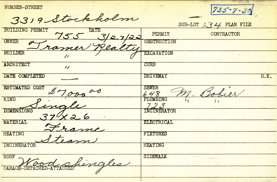 3319 Stockholm Road Shaker Heights, OH 44120 PARCEL ID: 735-07-030 Building Permit Date: 03-27-1922 Plan File Number: 10715, 12036 Microfilm Roll: NewRoll#5, NewRoll#10 Neighborhood: Fernway Owner: Tramer Realty Builder: Tramer Realty Architect: Tramer Realty Estimated Cost: 7000 Kind: Single, Single Residence or Dwelling Material: Frame Heating: Steam Roof: Wood Shingle |